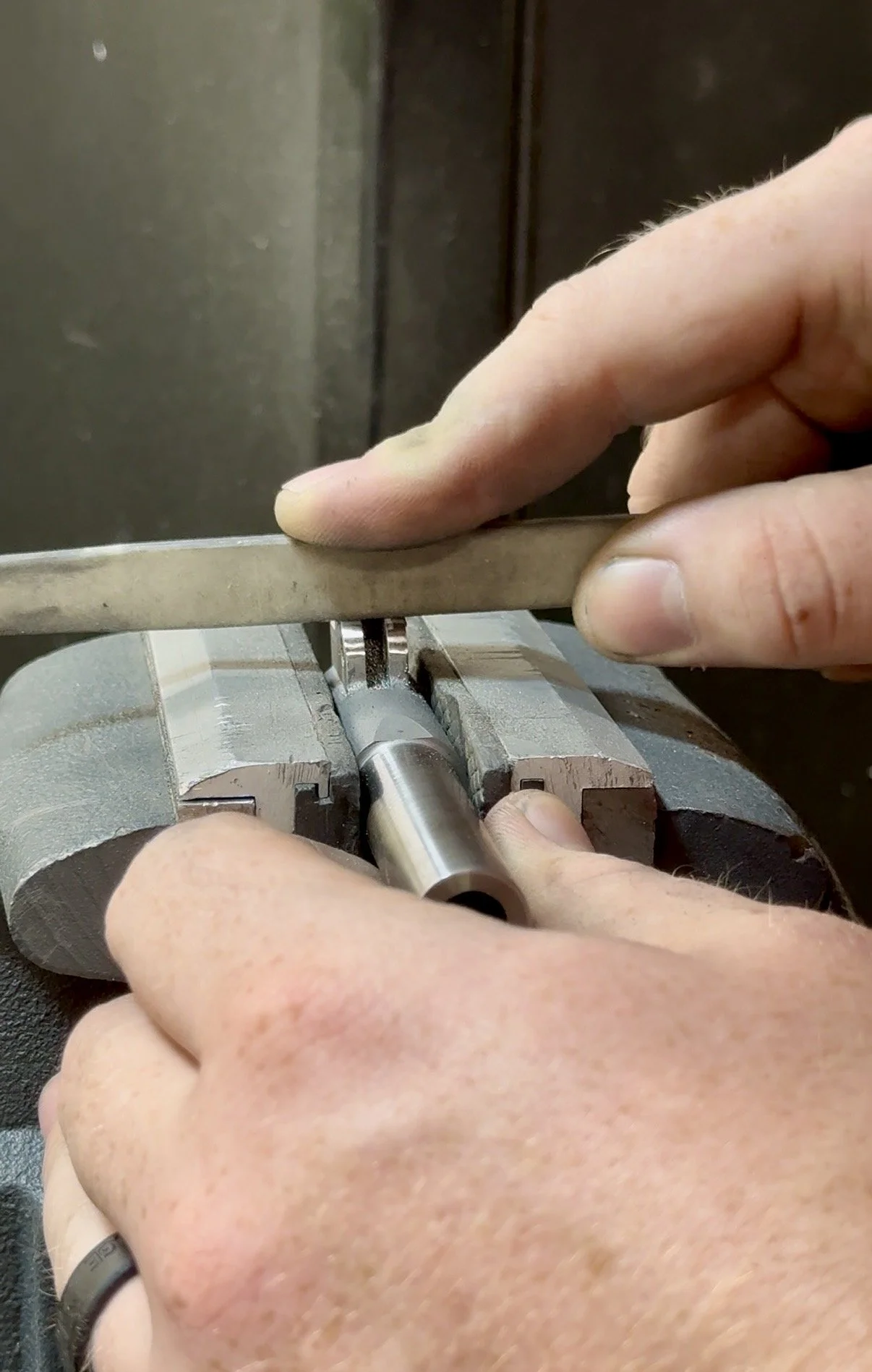 Each pistol begins with U.S. machined billet steel components that are carefully fitted and refined during assembly. Our team also performs detailed surface preparation, machining mark removal, and hand beveling before the final finish is applied.